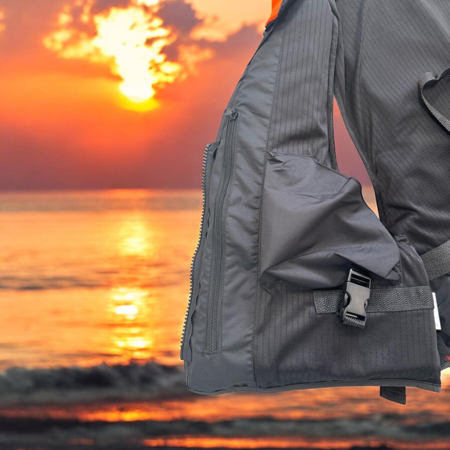 Gilet di salvataggio certificato CE con galleggiabilità 100 N, progettato per kayakisti e appassionati di sport acquatici.